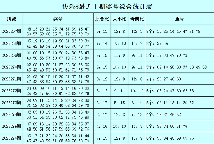 福彩快乐8第2025276期开出奖号:03 17 21 22 24 30 33 34 41 44 45 47 48 59 61 68 69 76 78 79,其中奖号质合比为7:13,四区比为2:6:6:6,包含6个重号33、34、48、59、69、76,包含连码21 22、33 34、44 45、47 48、68 69、78 79,包含2个邻号47 68。