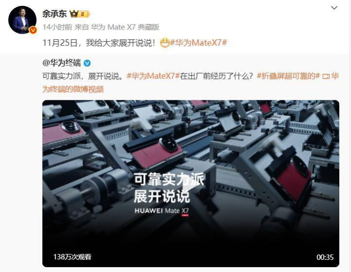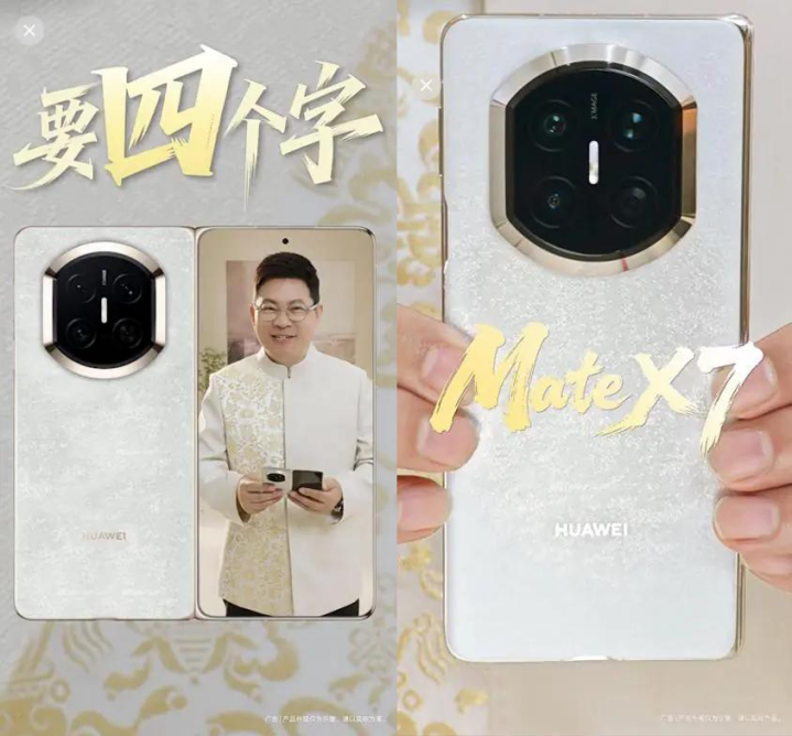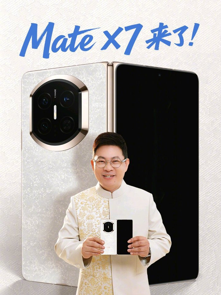 日前, @华为终端 直接晒出了Mate X7新一代大折叠手机的真机海报,并配文称,“折叠旗舰,跃展新篇。11月25日14:30,华为Mate 80系列 | Mate X7及全场景新品发布会,敬请期待!”“光织云锦,卓然出众。#华为MateX7#,非遗与科技的跨界融合,握于掌心的艺术大作。#越展开越心动#”。