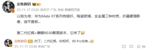 继官宣了华为Mate 80系列丨Mate X7等新品定档11月25日齐发以及Mate 80系列年度旗舰的外观和部分配置信息之后,日前,@华为终端 官博和华为常务董事、产品投资委员会主任、终端BG董事长 @余承东 再次公布了新一代大折叠产品华为Mate X7的外观和部分配置信息,该机不但将采用全新折叠玄武架构、第二代红枫镜头,而且大概率会搭载麒麟9030处理器。