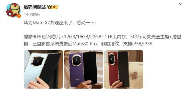 而数码博主“数码闲聊站”则爆料称,“麒麟9030系列芯片+12GB/16GB/20GB+1TB大内存,50Mp可变光圈主摄+潜望镜,三摄影像系统更接近Mate80 Pro,侧边指纹,支持IP58/IP59”。说到麒麟9030处理器,据称该处理器采用新一代国产工艺,在性能上将有新突破。从此次官宣和近期曝光的信息来看,华为Mate X7从处理器到影像,从架构到材质,每一项提升都直指折叠屏用户的真实痛点。
