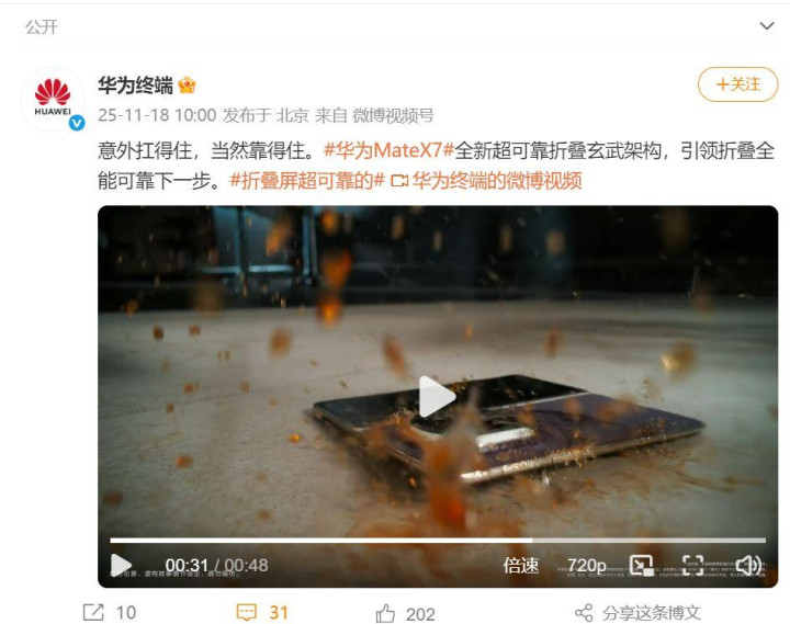 随后官方还发布预热视频,公布了华为Mate X7将采用更坚固的内外屏和全新折叠玄武架构的亮点、工作原理以及测试经过,并配文称,“意外扛得住,当然靠得住。#华为MateX7#全新超可靠折叠玄武架构,引领折叠全能可靠下一步。#折叠屏超可靠的#”。据官方称其为“超可靠折叠玄武架构”,在抗水、抗跌落、抗压、抗冲击等方面将带来技术升级。