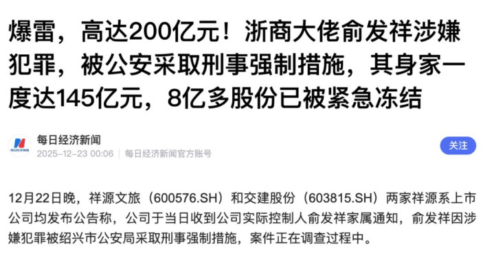 最新消息,交易中心的董事长—丁建林在双十二这天因此事被拷走,之后,祥源系实控人俞发祥也被强制采取措施。